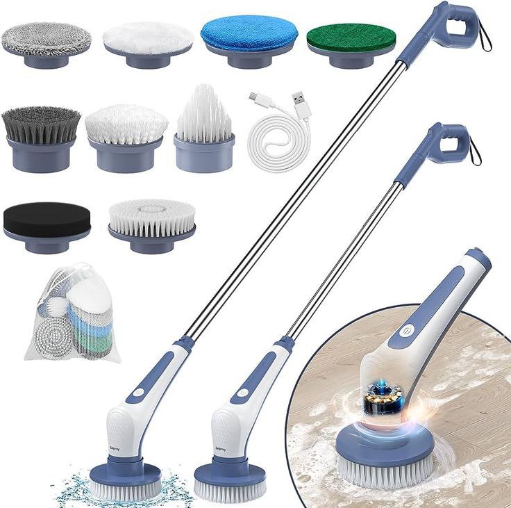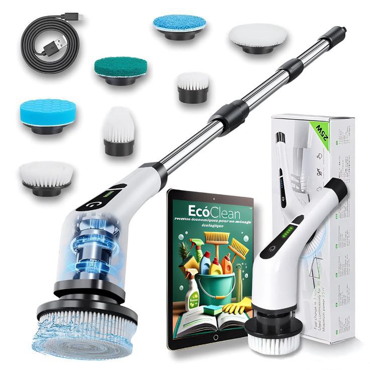 Brosse de nettoyage électrique pour douche avec 9 têtes de brosse remplaçables, brosse électrique sans fil avec poignée réglable pour salle de bain, douche, salon etc.